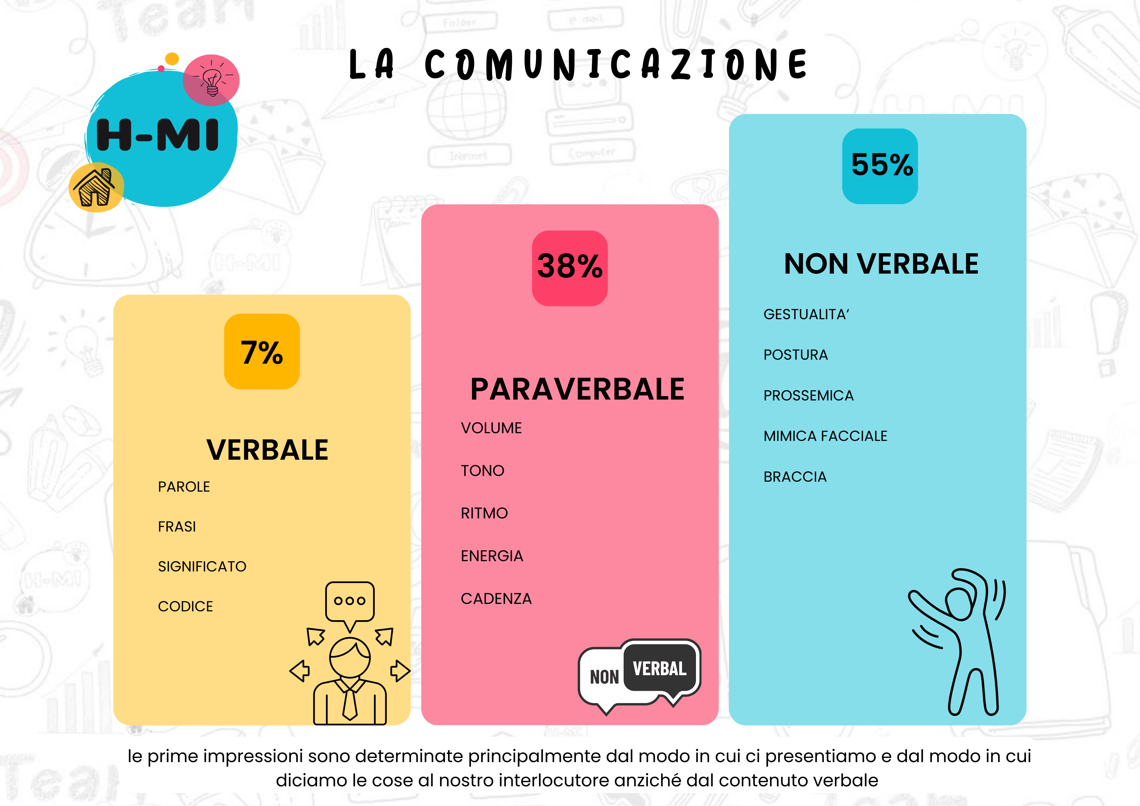 Sorpresa!! Solo il 7% di ciò che diciamo si basa sulle parole! Il restante 93%? Eccolo qui, tra il modo in cui diciamo le cose (paraverbale al 38% con volume, tono, cadenza) e tutto ciò che facciamo senza proferire parola (non verbale al 55% con gestualità, postura, prossemica).